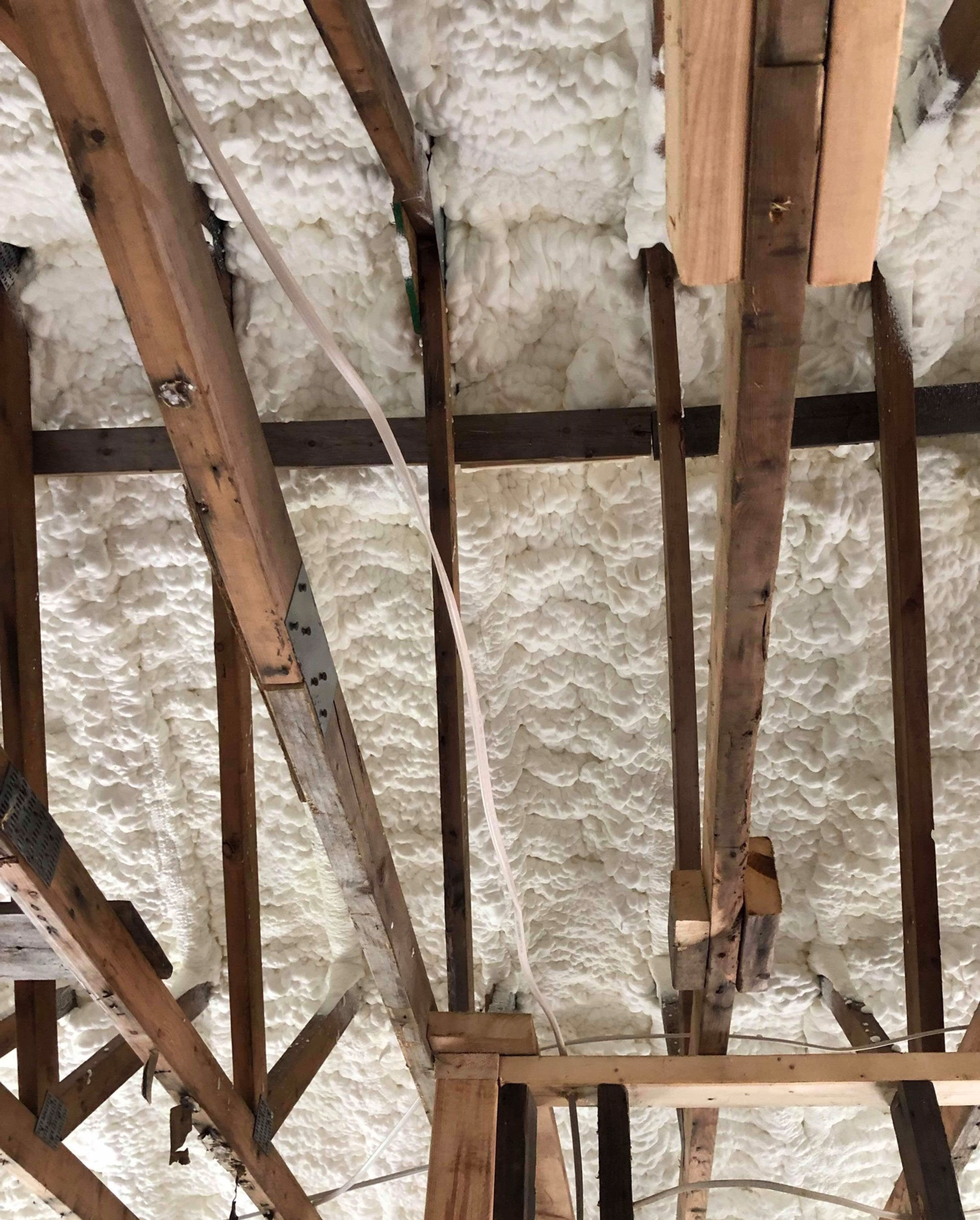 To combat this costly challenge, our team installed 6 inches of open cell sprayfoam insulation throughout the walls, as well as 4 inches of the same insulation along the roof deck of the house to reduce heat escaping through the ceiling.